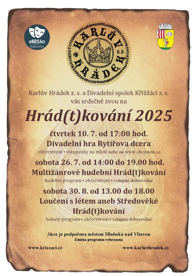 V rámci dalšího ročníku projektu Hrád(t)kování pod taktovkou Divadelního spolku Křížžáci se letos můžete opět těšit na divadelní představení Rytířova dcera ve čtvrtek 10. 7. od 17 hodin v podání Divadelního spolku Křížžáci, v sobotu 26. 7. na Multižánrové hudební Hrád(t)kování, kde se představí tři hudební žánry: Elecoustic – akustický rock, Trio Lukášovi – klasika, Klídek – bluegrass. A léto zakončíme Loučením s létem ve středověkém duchu aneb středověké Hrád(t)kování v sobotu 30. 8. 2025. Děkujeme městu Hluboká nad Vltavou za podporu a těšíme se na Vás!